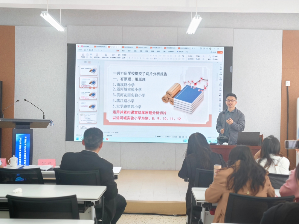 经验分享传妙招,专家引领赋新能。运河城实验小学、漓江路小学教师代表依次分享学校在课堂结尾艺术切片教学中的实践经验,为全区切片教学推广提供了优秀范例。河南师范大学博士霍亮针对本次切片教学汇报内容进行点评指导,既肯定了各校的实践成效,也提出了中肯的改进建议,助力各校优化切片教研方法。