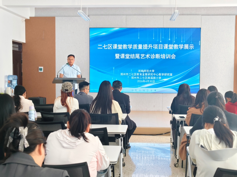 春和景明,研思致远;深耕课堂,提质增效。2026年4月30日,二七区课堂教学质量提升项目课堂教学展示暨课堂结尾艺术诊断培训会在郑州市二七区南溪路小学隆重举行。河南师范大学教授、博士生导师、河南省中小学课堂教学研究中心主任魏宏聚,河南师范大学博士霍亮,二七区教育发展研究中心教学研究室主任石明晶、副主任禹玲玲、连红,南溪路小学党支部书记、校长孙西岭,全区12所项目校业务领导、教师代表共同参与培训。